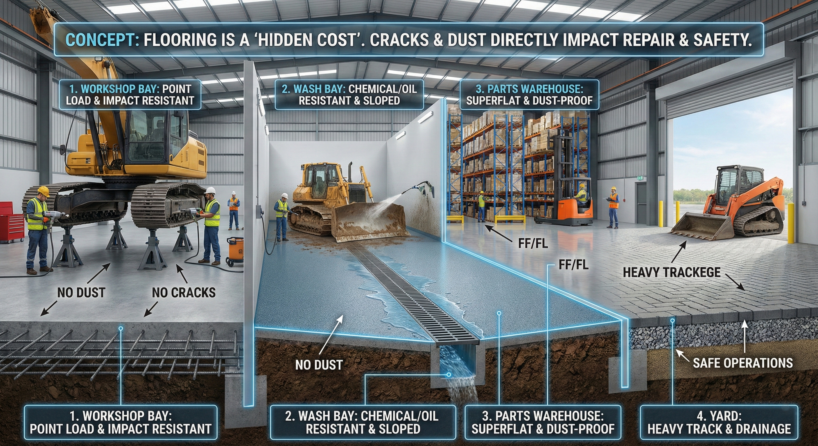 พื้นของศูนย์เครื่องจักรหนักเจอทั้ง แรงกดสูง (ตีนตะขาบ/ล้อ), แรงจุด (ขาตั้ง/แจ็ค), แรงกระแทก และ สารเคมี/น้ำมัน หลักการคือ “แยกโซนตามโหลด” แล้วกำหนดสเปกให้เหมาะ ไม่ใช่เทหนาเท่ากันทั้งไซต์