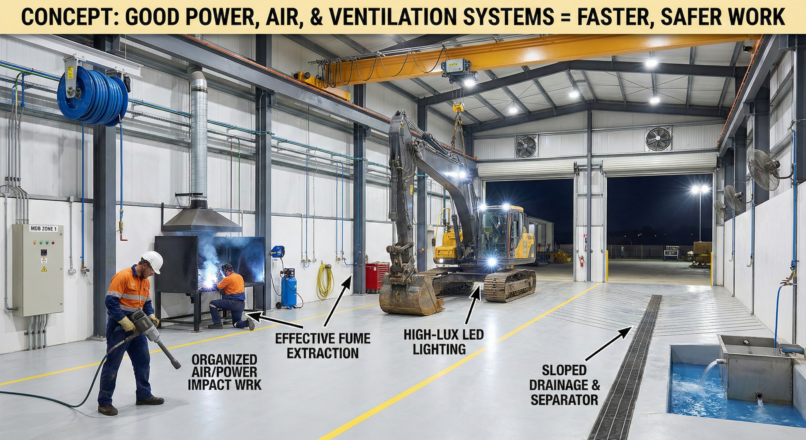 ศูนย์ซ่อมเครื่องจักรหนักเป็น “โรงงานขนาดย่อม” ระบบต้องออกแบบให้รองรับงานจริง เช่น งานเชื่อม/เจียร, อุปกรณ์ยก, ปั๊มลม, เครื่องมือไฟฟ้า, ระบบล้าง และการจัดการน้ำมัน/ของเสีย